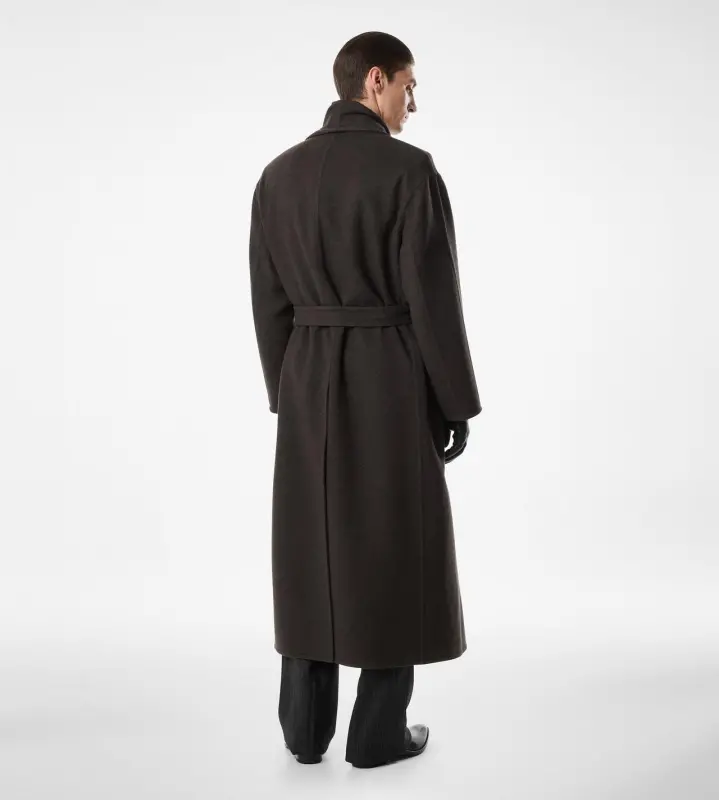 A pure cashmere coat, unlined to enhance its lightness. The shawl collar introduces a subtle disruption within TOM FORD’s aesthetic, balancing heritage codes with a modern touch.